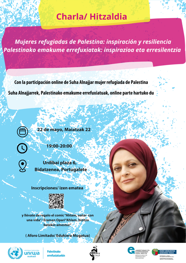 El próximo 22 de mayo os invitamos a Bidatzenea, la Casa de Todas las Mujeres de Portugalete, para participar en la charla-coloquio Mujeres refugiadas de Palestina: inspiración y resiliencia.