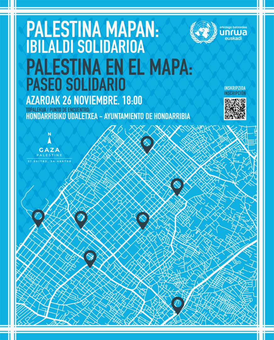 El Mapa Sonoro Ilustrado propone paseos solidarios en diferentes municipios de Gipuzkoa, donde las personas participantes recorren itinerarios guiados por relatos sonoros en distintas paradas. La actividad combina arte, educación y tecnología para fomentar la reflexión colectiva, la empatía y la solidaridad con la población refugiada de Palestina, promoviendo la comprensión intercultural a través del sonido y la ilustración.
